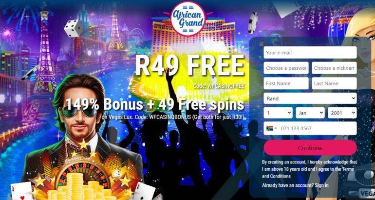 Register in the AfricanGrand Casino and redeem a no deposit bonus that contains 49 Free Rand. In order to receive free bonus, player must activate the bonus code “WFCASINOFREE” on registration page, and then successfully complete registration procedure. The casino will then instantly credit you free spins.